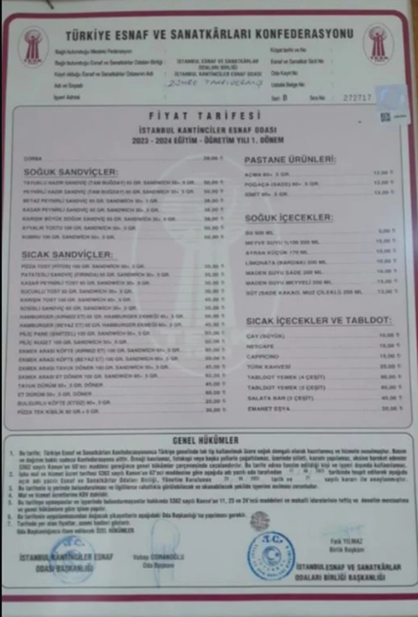 İstanbul Kantinciler Esnaf Odası, 2023-24 eğitim öğretim yılı 1. dönemine ilişkin fiyat tarifesini yayımladı. Cumhuriyet'te yer alan habere göre, fiyat tarifesi listesinde, 90 gram simit, 60 gram poğaça ve açmanın fiyatı 12 TL olarak belirlendi. Meşrubat fiyatlarındaki artışta dikkatleri çekerken meyve suyu 15 lira, küçük ayran 10 lira ve süt çeşitleri 13 lira şeklinde fiyatlandı.