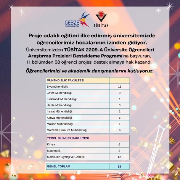 Türkiye Bilimsel ve Teknolojik Araştırma Kurumu (TÜBİTAK) Bilim İnsanı Destek Programları Başkanlığı (BİDEB) tarafından yürütülen 2209-A- Üniversite Öğrencileri Araştırma Projeleri Destekleme Programı ve 2209-B Üniversite Öğrencileri Sanayiye Yönelik Araştırma Projeleri Desteği Programı 2023 Yılı 1. Dönem çağrısı destek hakkı kazananların listesi yayınlandı. TÜBİTAK 2209-A Üniversite Öğrencileri Araştırma Projeleri Destekleme Programı'na başvuran, GTÜ 11 bölümünden 58 öğrencinin projesi destek almaya hak kazandı.