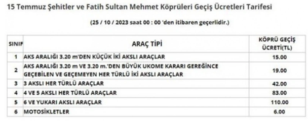Otoyol ve köprü ücretleri tarifesi şöyle olacak:
