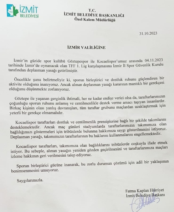 İzmit Belediye Başkanı Fatma Kaplan Hürriyet İzmir Valiliğine faks göndererek Göztepe ile Kocaelispor’un 4 Kasım’da oynayacağı müsabakada alınan deplasman yasağı kararının yeniden gözden geçirilmesini talep etti. Hürriyet’in İzmir Valiliğine gönderdiği faksta şu ifadeler kullanıldı; “İzmir’in güzide spor kulübü Göztepespor ile Kocaelispor’umuz arasında 04.11.2023 tarihinde oynanacak olan TFF 1. Lig karşılaşmasına İzmir İl Spor Güvenlik Kurulu tarafından deplasman yasağı getirilmiştir.
