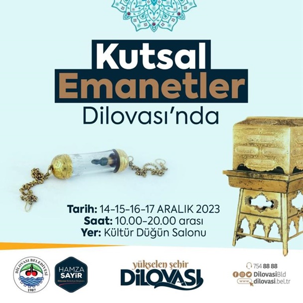 Dilovası Belediyesi organizasyonu ile gerçekleşecek ve 4 gün ücretsiz olarak sergilenecek Sakal-ı Şerif ve Kutsal Emanetler Sergisi 14-15-16-17 Aralık tarihlerinde saat 10:00 ile 20:00 saatleri arası Dilovası Belediyesi Kültür Düğün Salonu’nda sergilenecek.