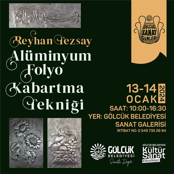 Gündem, 27 Aralık 2023 16:01Gölcük Belediyesi kültür-sanat etkinlikleri kapsamında 13-14 Ocak tarihlerinde; eğitmen Reyhan Tezsay tarafından sanatseverlere alüminyum folyo kabartma tekniği eğitimi verilecek.