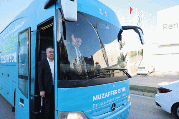 Darıca’ya girişte seçim otobüsleriyle karşılanan Başkan Muzaffer Bıyık, seçim otobüsüne binerek vatandaşları selamladı. Kısa bir şehir turu atarak AK Parti Darıca İlçe teşkilatına gelen Başkan Muzaffer Bıyık’a yol boyunca vatandaşlar ve esnaflar sevgi gösterilerinde bulundu.