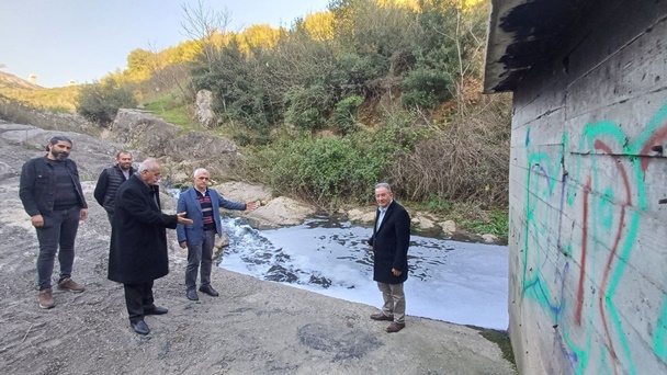 Derenin aktığı yerlerdeki köpüklenme oranlarının çok yüksek olduğunu söyleyen Gergerlioğlu, “Olayın vahamet boyutları derenin biraz daha sularının durulduğu yerlerde daha da artıyor. Bunlar beyaz bir köpük değil. Kimyasal var burada. Koku var ve suların durulduğu noktada bir köpük gölü oluşmuş durumda. Şu hale bakın! Köpeğin cesedinden arta kalan izler, bir köpek burada sudan içtiği için zehirlenip ölmüş. Belediye ne iş yapıyor anlamak mümkün değil. Organize sanayiden birileri atıkları atıp Dilovası halkının kanser olmasına yol açıyor! Şu hale bakın! Burada bir sürü ağır metal var belli ki. Numune alan var mı? Çevre İl Müdürlüğü ne yapıyor? Anlamak mümkün değil. Sanırım burada başka köpek cesetleri de var. Su içen koyunların telef olduğu yönünde bir söylenti de var.” Çok ağır bir koku da var. Belediye nerede diye soruyoruz? Çevre İl Müdürlüğü nerede? Kocaeli Valisi ne iş yapıyor? Şu hali görmüyor mu? Biz DEM Parti Dilovası Eş Başkan Adayımız ile keşif, gözlem yapıyoruz ve burada kanserojen maddeleri tespit ediyoruz işte apaçık ortada. Hani denetim? Hani arıtma Sayın Vali?” şeklinde konuştu.