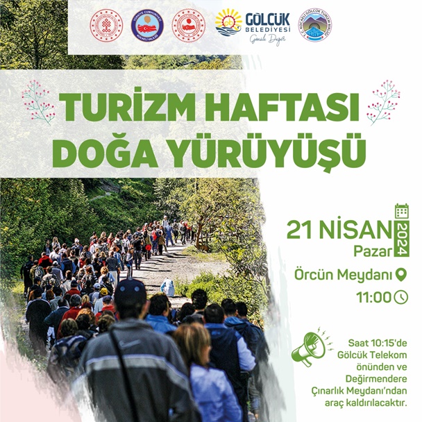 Gündem, 18 Nisan 2024 14:12Gölcüklüler; Turizm Haftası kapsamında; 21 Nisan Pazar günü Örcün’den başlayacak doğa yürüyüşünde bir araya gelecek.
