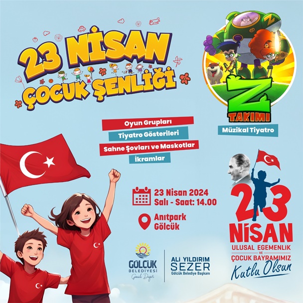 Türkiye Büyük Millet Meclisi'nin açılışının 104'üncü yılında, Gazi Mustafa Kemal Atatürk'ün çocuklara armağanı olan 23 Nisan Ulusal Egemenlik ve Çocuk Bayramı'nda; Gölcük’te dolu dolu kutlanacak. Anıtpark’ta düzenlenecek Çocuk Şenliği’nde; TRT Çocuk Müzikal Tiyatro Z Takımı, sahne şovları, maskotlar ve çeşitli gösteriler, çocuklarla buluşacak.