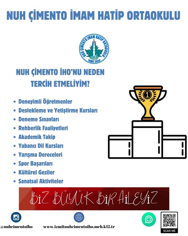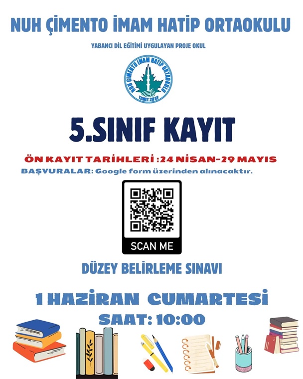 İzmit Nuh Çimento İmam Hatip Ortaokulu’na ilişkin başvurular Google form üzerinden alınacak. Düzey belirleme sınavı ise 1 Haziran Cumartesi günü saat 10.00’da başlayacak. Sonuçlar 10 Haziran’da duyurulacak. Kesin kayıtlar 24 Haziran – 5 Temmuz 2024 tarihleri arasında gerçekleştirilecek.