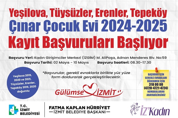 Çocukların modern ve donanımlı bir şekilde geleceğe hazırlandığı İzmit Belediyesi Çınar Çocuk Evleri için ön kayıtlar başladı. Yeşilova, Tüysüzler, Tepeköy ve Erenler Çınar Çocuk Evi’ne başvuru yapmak isteyen 3-5 yaş arası çocuğu olan ebeveynler 10 Mayıs Cuma gününe kadar Kadın Girişimciler Merkezi’nde (İZGİM) başvurularını yüz yüze gerçekleştirebilecek. Detaylı bilgi almak isteyen vatandaşlar 318 00 00 (4720 – 4721 – 4724) numaralı telefonu arayabilir.