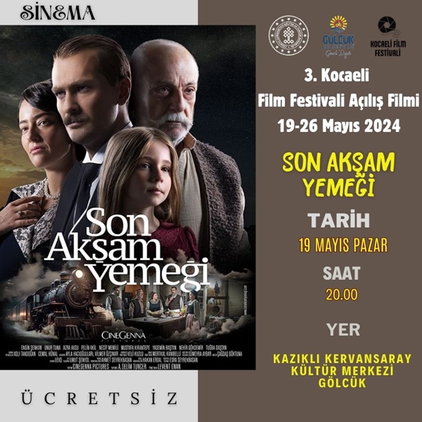 Gündem, 17 Mayıs 2024 15:10Gölcük Belediyesi ile Kocaeli İl Kültür ve Turizm Müdürlüğü ortaklığında; 3. Kocaeli Film Festivali kapsamında, Kervansaray’da; “Son Akşam Yemeği” adlı film gösterimi düzenlenecek.
