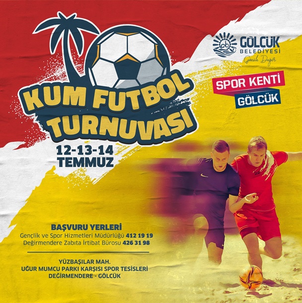 Gölcük Belediyesi, yaz etkinlikleri bu yıl da ilçede dolu dolu geçecek. Etkinlikler kapsamında her yıl düzenlenen Kum Futbol Turnuvası ise 12-13-14 Temmuz 2024 tarihleri arasında gerçekleşecek. Değirmendere sahilinde her yıl büyük heyecana sahne olan turnuvada 32 takım katılabilecek. Turnuvaya takımlar; 4 as ve 3 yedek olmak üzere 7 kişiden oluşacak. Yüzbaşılar Mahallesi Uğur Mumcu Parkı karşısı spor tesislerinde çekişmeli maçlara sahne olacak turnuvaya kayıtlar ise başladı.