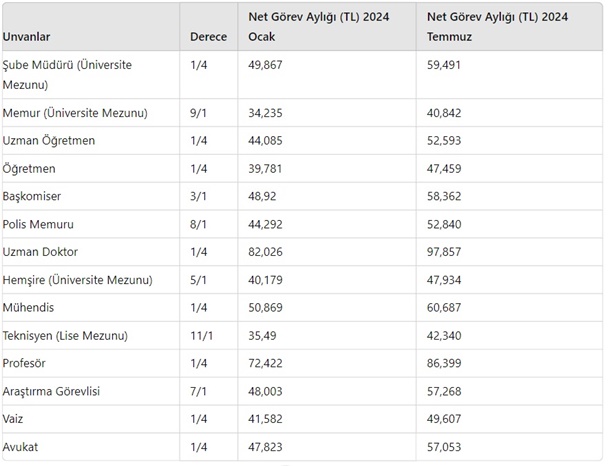 Temmuz ayında yapılan yüzde 19,3'lük zamdan sonra derece ve mesleklere göre bazı memur maaşları şöyle oldu:
