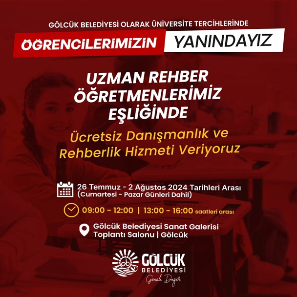 Gündem, 25 Temmuz 2024 14:13Gölcük Belediyesi, her yıl olduğu gibi Yüksek Öğretim Kurumları Sınavı’nda (YKS) en doğru tercihi yapmak için karar vermeye çalışan üniversite adaylarına ücretsiz tercih danışmanlığı verecek.
