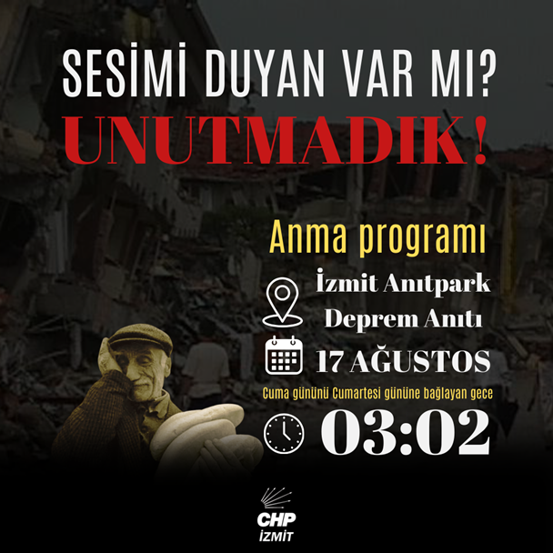 Cumhuriyet Halk Partisi(CHP) İzmit İlçe Başkanı Gökhan Ercan, 17 Ağustos Marmara Depremi’nin 25’inci yılı dolayısıyla yazılı bir basın açıklaması yaparak, şehrimizde ve bölgemizde yitirdiğimiz insanlarımızı andı. Ercan açıklamasında, “Tarihimizin en acı depremlerinden, şehrimizin büyük yıkıma uğradığı 17 Ağustos 1999 Marmara Depremi’nin 25’inci yılında en temel insan haklarından olan “Barınma hakkının” tüm yurttaşlarımıza sunulabilmesi amacıyla depremi unutmama, unutturmama ısrarını sürdürmeye, güvenli ve sağlıklı yapı üretimi sağlanana kadar devam edeceğiz. Bugüne kadar depreme karşı hazırlık, yapı güvenliği, hasar tespiti gibi konularda fazlaca konuşuldu. Fakat depremin ülkemizde her defasında afete dönüşmesine bir türlü engel olunamadığına yakın zamanda yaşadığımız depremlerde de maalesef şahit olduk” ifadelerini kullandı.