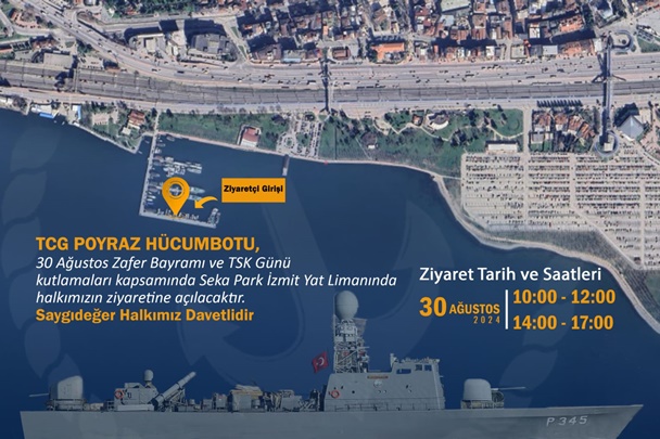 30 Ağustos Zafer Bayramı ve TSK Günü kutlamaları kapsamında TCG Poyraz Hücumbotu 30 Ağustos 2024 tarihinde İzmit Yat Limanını ziyaret ederek 10.00 – 12.00 ile 14.00 – 17.00 saatleri arasında halkımızın ziyaretine açılacaktır. Kamuoyunun bilgisine saygıyla duyurulur.