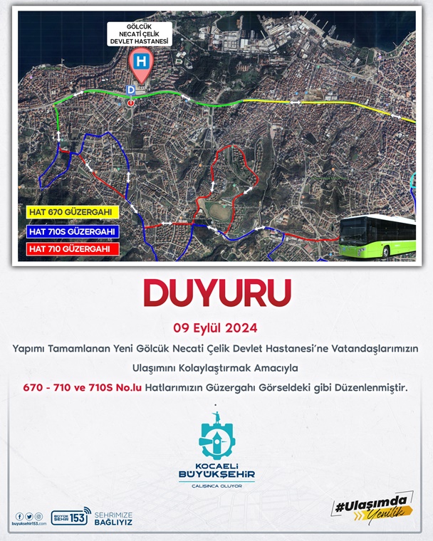Gündem, 06 Eylul 2024 15:11Gölcük Necati Çelik Devlet Hastanesine ulaşım için 3 hattın güzergahında değişikliğe gidildi.