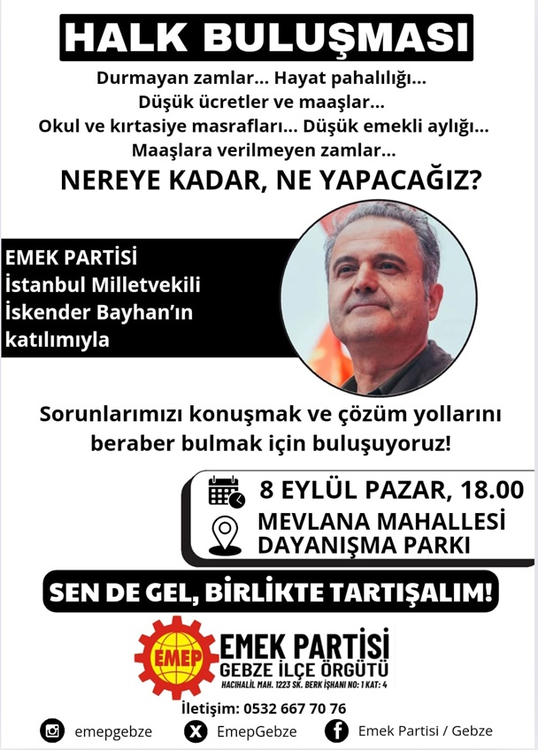 EMEP İstanbul Milletvekili İskender Bayhan’ın katılımıyla Gebze'de halk toplantısı düzenlenecek. EMEP Gebze İlçe Başkanı Yusuf Akar, "Durmayan zamlar, hayat pahalılığı, düşük ücretler, okul ve kırtasiye masrafları, düşük emekli aylığı... Nereye kadar böyle gidecek ve biz işçi emekçiler ne yapacağız? Sorunlarımızı konuşmak ve çözüm yollarını tartışmak için İstanbul Milletvekilimiz İskender Bayhan'ın katılımıyla düzenleyeceğimiz halk toplantısına bütün işçi ve emekçileri davet ediyoruz" dedi.