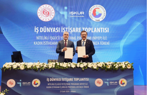 TOBB Başkanı M. Rifat Hisarcıklıoğlu ev sahipliğinde, Çalışma ve Sosyal Güvenlik Bakanı Vedat Işıkhan’ın katılımıyla TOBB İkiz Kuleler Konferans Salonu’nda gerçekleşen İş Dünyası İstişare Toplantısı’na Yönetim Kurulu Başkanı Abdurrahman Aslantaş katıldı. Toplantıda Türkiye İş Kurumu (İŞKUR) ile TOBB arasında; “Nitelikli İş Gücü Yetiştirme Programı (NİYEP) ve “Kadın İstihdam İş Birliği” protokolleri imzalandı.