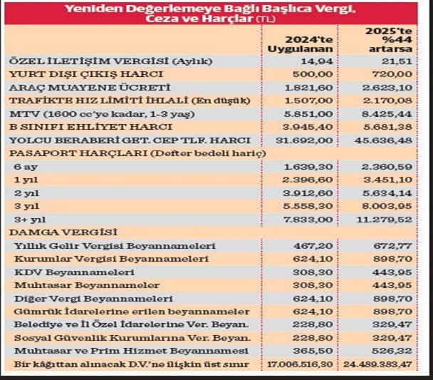 2025-2027 Orta Vadeli Programda (OVP), 2025 yılının tümünde tüketici fiyatları (TÜFE) bazında enflasyon oranı yüzde 17,5 düzeyinde öngörülerken, yılın başında Emlak, Çevre Temizlik, Özel İletişim ve Motorlu Taşıt gibi vergiler ile resmi işlemlerde alınan çeşitli harçlar, araç muayene ücretleri, Gelir Vergisi tarife dilimleri ve trafik cezaları yüzde 44 dolayında zamlanacak.
