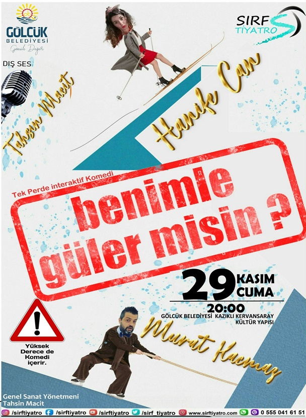Gölcük Belediyesi kültür-sanat etkinlikleri kapsamında düzenlenen tiyatrolar, bir kez daha tiyatro severleri kahkahaya davet ediyor. Etkinlikler kapsamında “Benimle Güler Misin?” adlı tiyatro oyunu 29 Kasım Cuma günü Kazıklı Kervansarayı Kültür Yapısı’nda sahnelenecek.