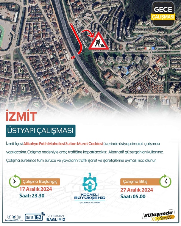 Büyükşehir Belediyesi’nden konuyla ilgili yapılan açıklamada şu ifadelere yer verildi; “Alikahya Stadyum Tramvay Hattı Yapım projesi kapsamında, Sultan Murat Caddesi güzergâhı üzerinde ray döşenmesine ait imalatlar yapılacak olup, bu esnada Anadolu Otoyolu menfezi altı araç geçişine 17/12/2024 tarihinde saat 23:30’dan geçerli olmak üzere 27/12/2024 saat 05:00’e kadar çift taraflı olarak tamamen kapatılacaktır. İmalatların yapımının tamamlanmasının ardından, menfez araç geçişine tekrar açılacaktır. Bu zaman zarfında mevcut trafik akışında herhangi bir olumsuz durum oluşmaması için plan üzerinde gösterilen güzergâhların kullanılması gerekmektedir.”