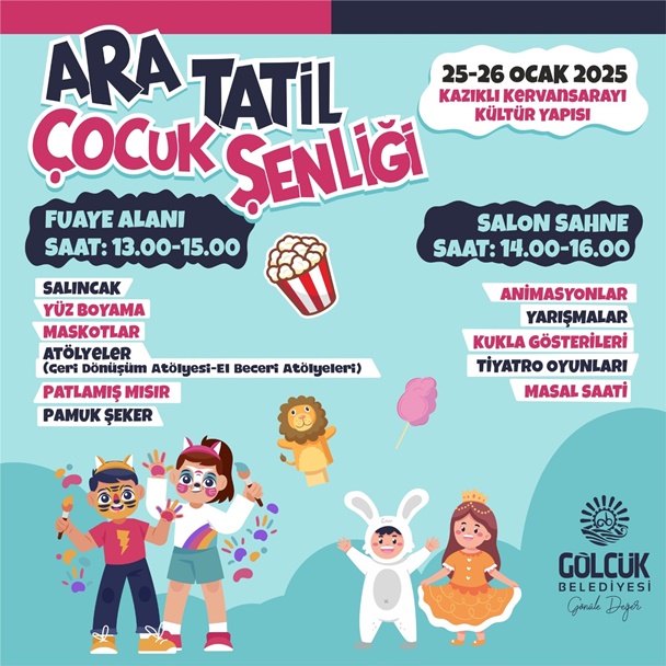 Gölcüklü çocuklar, 2024-2025 yılı yarıyıl tatilinde eğlenceye doyacak. Gölcük Belediyesi, yarıyıl tatiline girecek çocuklar için dolu dolu etkinlikler içeren “Ara Yıl Çocuk Şenliği” düzenleyecek. 25-26 Ocak tarihlerinde Kazıklı Kervansarayı Kültür Yapısı’nda düzenlenecek olan şenlikte birbirinden güzel atölyelerde doyasıya eğlenerek, keyifli bir şekilde yeni bilgiler öğrenecekler.