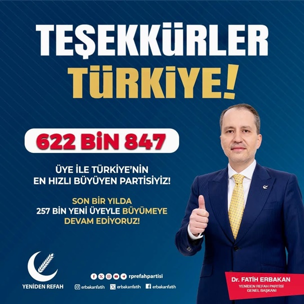 Yeniden Refah Partimiz güçlendikçe büyüyor, büyüdükçe güçleniyor. Milletimizin yönetimde adalet paylaşımda da adalet arayışının yegâne merkezi Yeniden Refah Partisi olduğu acıktır. Zira son bir yılda tüm Türkiye’de 257 bin vatandaşımızın partimize katılması ve Türkiye’nin üye sayısı bakımından en büyük 3. Partisi olmamız doğru isler yaptığımızın ve doğru yolda olduğumuzun göstergesidir.